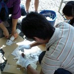 暑かったあ、今日は!ろうそく作りは野外でおこないました。