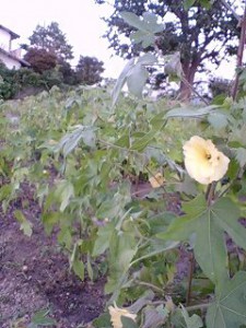 事務局に帰ってきて畑をみると棉の木がますます元気に育って、花をたくさん付けています。