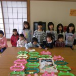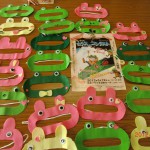 プレゼント作りを兼ねて一品持ち寄り。プレゼントはフエルトで作るカエルのティッシュカバーです。型紙にそって切り、ボンドで目を付け、ホッチキスでゴムをつければ出来上がり。簡単な工程なのに意外と楽しい!みんな夢中になっておもいおもいの「かえる」や「うさぎ」が出来上がりました。かわいい!