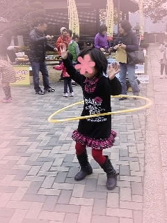 全身を使って遊ぶフラフープ。寒いと言っていたのに、上着を脱いで遊びだす子供達。