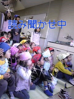 バッチリに装着したら、まずは、読み聞かせで絵本の世界へ。子供達は、おおきなかぶとちびくろさんぼに夢中になりました。