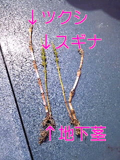 この土筆に引き続いて、細い線状の緑の葉っぱが出てくる。