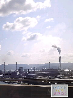 瀬戸大橋の香川側に、工場地帯があります。そこにある、煙突からもくもくと。