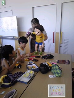 目の前で動く「じんたろうくん」が、劇についてを子供達に!グッと引き付けられて、子供達は真剣な顔に!