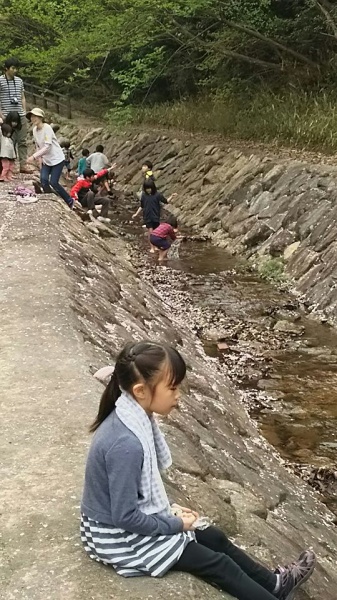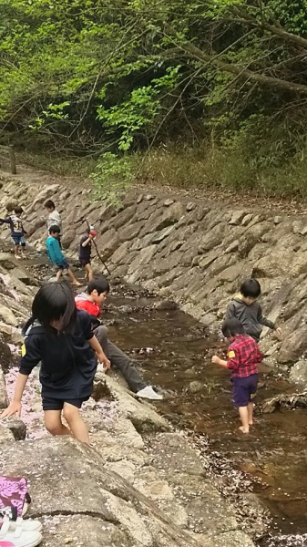 自由遊びでは、小川に入って水の感触を楽しんだり、しりもちついてびしょ濡れになったりしました。