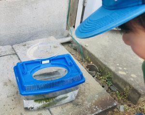 あめんぼを捕まえてうれしそうな男の子