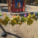 色ビニール袋に空気を入れて紐でくくって走ったり、落ち葉を洗濯ばさみでつるしたり、フラフープ、ボードの車、ゴムホース、プレイキットの箱が空っぽになるくらい遊びました♪